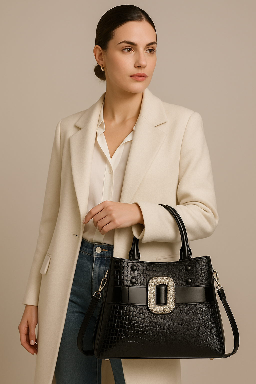Introducing The Momentum Tote — a radiant symbol of aligned ambition and unapologetic elegance. With its high-gloss crocodile finish, polished metal handle, and shimmering diamond accents, this tote was crafted for the woman who knows her next level isn't a destination — it's her current reality. Structured, powerful, and unmistakably elevated, The Momentum Tote carries more than style — it carries certainty.